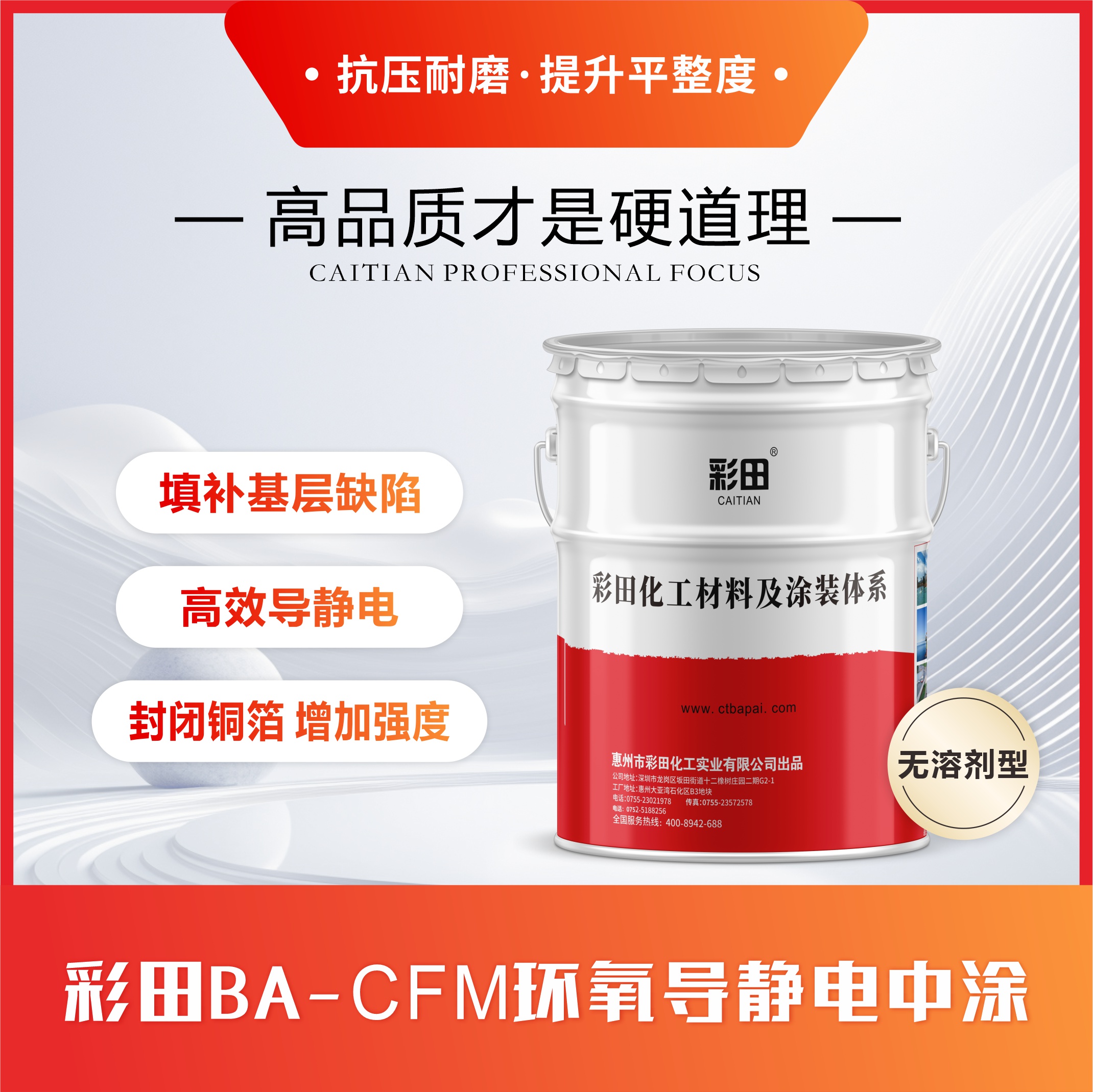 彩田BA-CFM無(wú)溶劑環(huán)氧防靜電中涂是一種常溫固化雙組份無(wú)溶劑型環(huán)氧樹(shù)脂漆。無(wú)溶劑、環(huán)保型;良好的導(dǎo)電性。用途說(shuō)明: 調(diào)配石英粉成環(huán)氧膩?zhàn)樱岣叩匕逋苛系膹?qiáng)度、平整度和導(dǎo)電性;防靜電地坪工程中用來(lái)封閉銅箔。