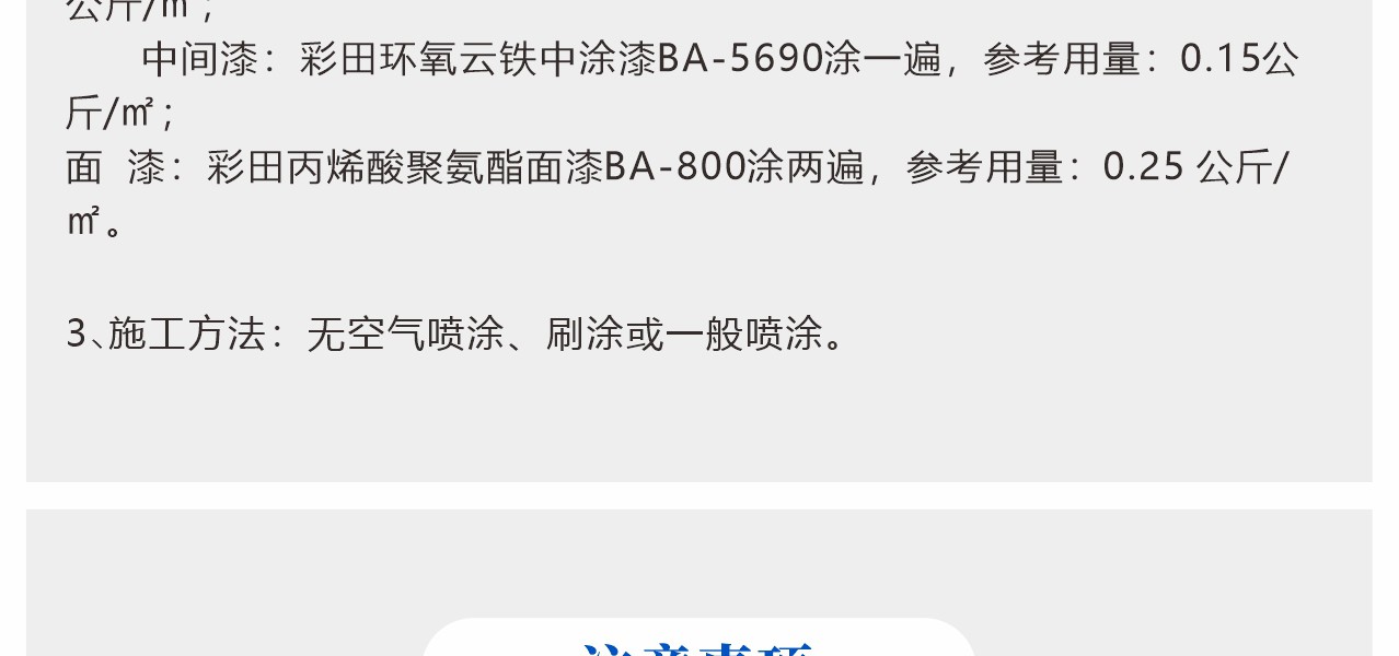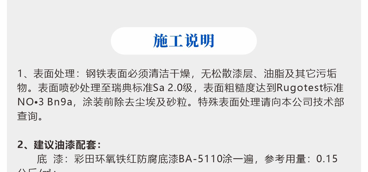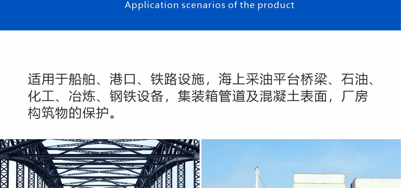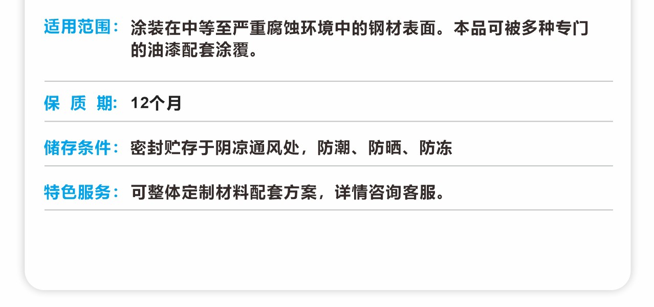 涂裝在中等至嚴重腐蝕環境中的鋼材表面。本品可被多種專門的油漆配套涂覆。